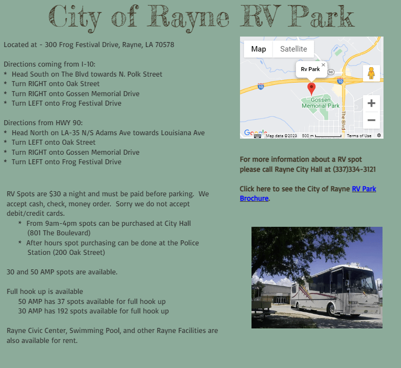 The City of Rayne offers camping spots for the 51st Rayne Frog Festival. $90 for all 3 nights of the festival. For more information, call Rayne City Hall at 337-334-3121.