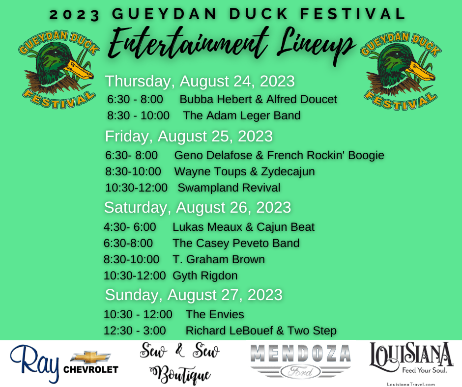 The upcoming Gueydan Duck Festival’s Musical Lineup as it will feature a mix of staples of the Louisiana Festival scene, many up-and-coming acts, and a true Country Music Legend. T. Graham Brown will bring his soulful; mix that made him a Country Legend. Bubba Hebert and Alfred Doucet, who grew up attending the Gueydan Duck festival, will kick the entertainment off on Thursday, followed by one of the hottest acts in Acadiana, The Adam Leger Band. Get your dancing shoes ready for Friday night’s fais do-do with Geno Delafose and French Rockin Boogie, “Le Boss” Wayne Toups and Zydecajun, and Swampland Revival. Lukas Meaux, and Casey Peveto, will play after the parade on Saturday. T. Graham Brown and Gyth Rigdon will wrap up the festivities on Saturday. The Envies and Richard LeBouef and Two-Step will play on Sunday.