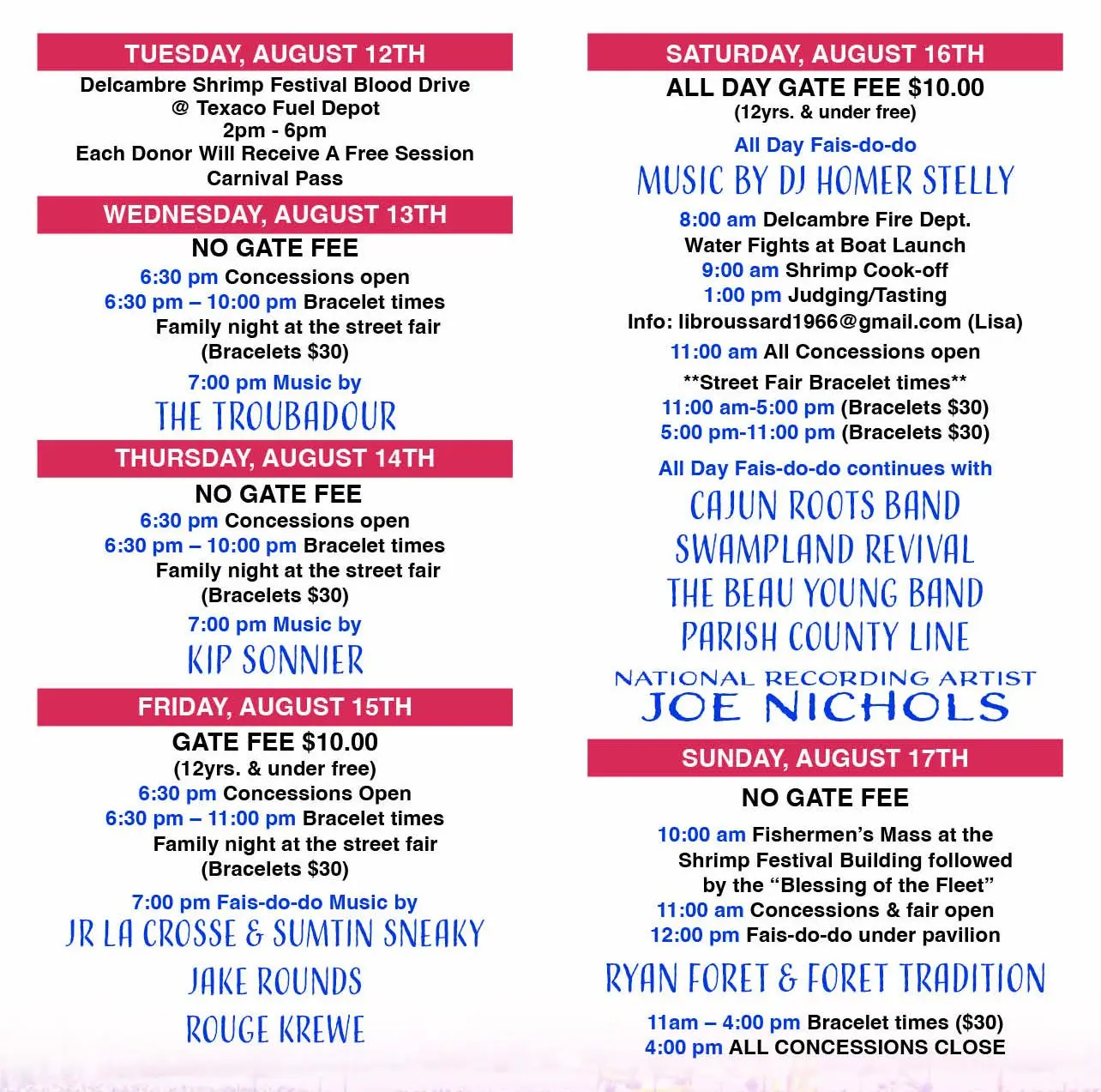 Headlined this year by Joe Nichols, among other Louisiana Musical artists like Parish County Line, Beau Young Band, Swampland Revival, Cajun Roots, Rouge Krewe, Jr. Lacrosse, and Sumtin Sneaky, Jake Rounds, Kip Sonnier, The Troubadour, and Ryan Foret, and the Foret Tradition.